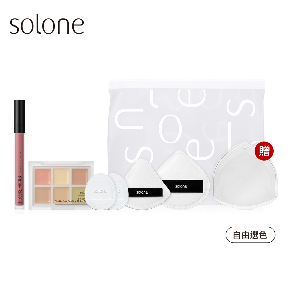 【新品】Solone 輕甜無瑕組(極柔無痕舒芙蕾海綿組+手指撲+遮瑕盤+腮紅液)贈 收納盒/栗子形+訂製夾鏈收納袋